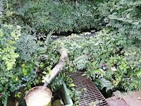 道路脇の崖から湧き出た水が塩ビ管を通して流れています。