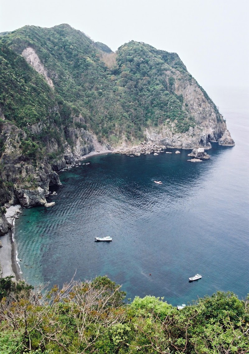 2005年4月に訪れました。通中学校の左側の細い道を入っていきます。小さな女の子を連れたオジサンに尋ねてみると、獣道になっていて野犬がいるから気を付けなさいとのこと。人家が尽きた所から山道になりましたが、踏跡もしっかりしてるし、山を越えていく送電線に沿っているので少し安心します。竹薮を刈った斜面を登り切ると海からの崖の上に出ました。ロストした送電線を探して左に進んでいくと見つかったので大丈夫なようです。下り始めて森から出ると海が広がり、沖には相島が浮かんでいます。踏板が錆びた鉄梯子を越えて、潮場の鼻燈台に到達しました。