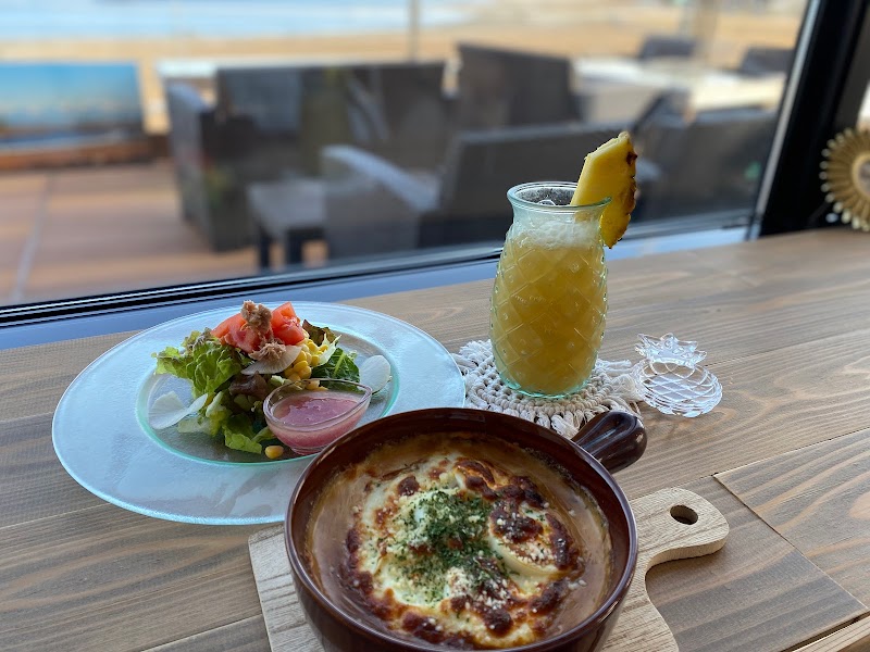 ハワイアンな雰囲気を楽しめるカフェ!素敵な内装の屋内も良いですが、オススメはテラス席♫心地よい潮風と波音を感じながらお食事をいただけます!今回いただいたのは、ケーキとパインソーダ。彩りも良く、写真映え間違いなしです!!予約が必要ですが、「推し活プレート」というメニューがあるみたい…次は予約して来るぞ〜!