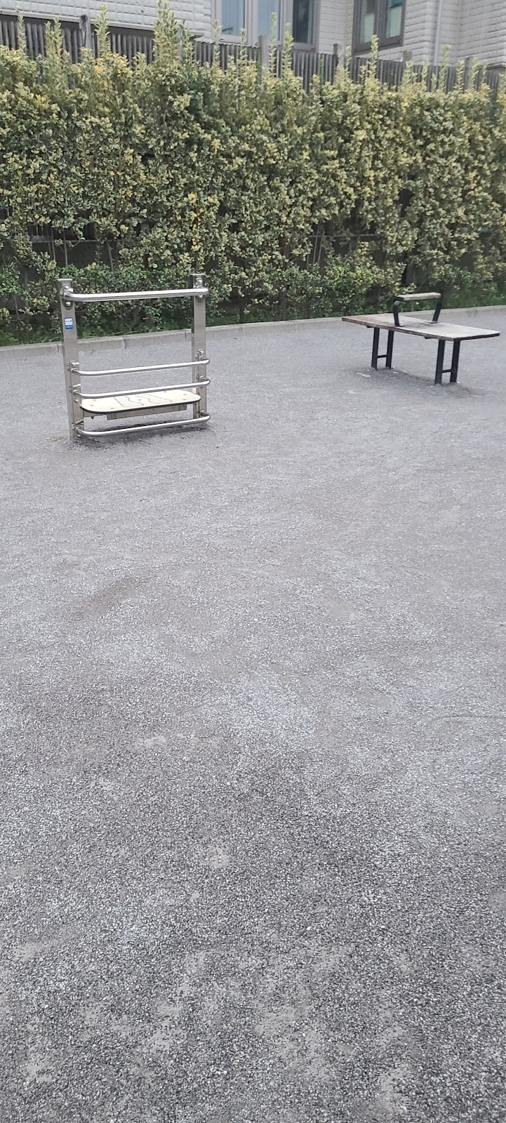 住宅に囲まれた空き地の印象。境界に沿って生垣があり、奥まった場所に滑り台が設置されています。