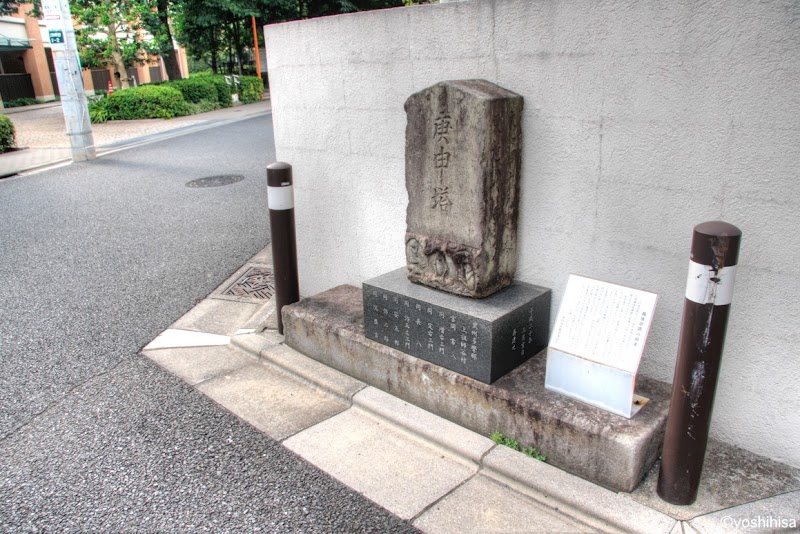 六郷田無道と瀧坂道の古道が交差する榎に建てられた庚申塔を後年こちらに移転したもの。現在地から榎に向かう道が六郷田無道、榎交差点で交差する道が瀧坂道。六郷田無道はたぶん室町時代からのもので現在の大田区六郷と西東京市田無を結ぶ。瀧坂道は奈良時代、武蔵国の主要道で府中と現在の渋谷道玄坂を結んでいた。江戸時代に甲州街道が整備される前は府中と江戸を結ぶ主要道として使われた。榎の交差点は運が良ければ富士山 の見えるポイントでもある。