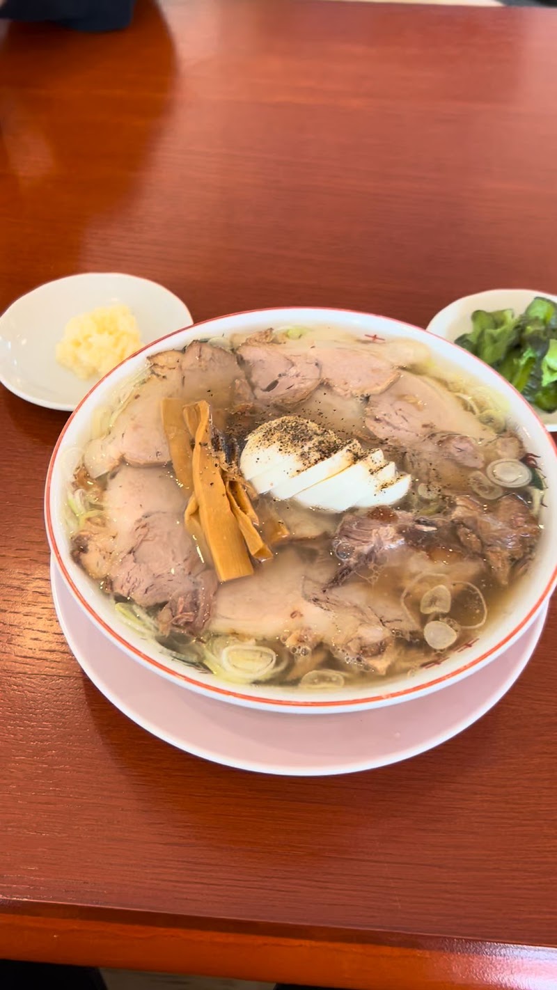 山形県の東根市のヨークタウン敷地内にあるラーメン屋さんです。カウンター席、テーブル席、小上がり席があります。券売機による食券購入制で、現金のみ対応です。水はセルフです。◼️注文したメニュー・チャーシューメン ¥1200・中華そば ¥880以前「鶏冠」さんだった店舗が、名前と味を変えてリニューアルオープンされたのだとか。ラーメン自体の方向性を変えての再発進とは、稀なケースですね。店内の様子に大きな変化はありませんが、ラーメンはまるで違います。いわゆる「ちゃん系ラーメン」を主にしたものとのこと。ちなみに「ちゃん系」とは、豚清湯に柔らか薄切りチャーシューと、平打ちストレート麺で、しょっぱうまぁーなライスが合う中華そばなのだそう。へぇ~そうだったのか!!平日の13時頃に訪れると、店内は既に落ち着いている感じ。券売機で食券を購入して、スタッフさんへと渡し、空いている小あがり席へと座ります。水はセルフで用意して、漬物や紅ショウガはフリーで置かれているのを取ってきます。下皿付きでラーメンが配膳されました。【チャーシューメン】器一面がチャーシューで覆われてる器内に、ペッパーまみれのカット玉子がきれいに並べられていたりと工夫がイイ感じ。メンマも添えられ、ネギがチャーシューの合間に漂ってます。チャーシューをどかして、箸を差し入れ麺を持ち上げると、平打ち中細の麺が現れます。これまた今までの鶏冠の麺ともまるで違うもの。スープは透明感があり、味わい甘じょっぱさが、とても飲み口が良いもの。さらに途中で、ニンニクを加えるとまた(゚д゚)ウマーそしてチャーシューが、ものすごいトロトロで、薄切りなものだから箸で持ち上げようとすると、崩れちゃうの。それらを箸で慎重に摘まんで、トロッと吸い込むのがまた旨し。甘いスープで、チャーシューもろとも飲めるような感じがめちゃ旨かった。この調子で、気づけばニンニクも全部投入し、スープも飲み干してました。なかなかにクセになるオイシイラーメンでした。今回は、紅ショウガやライスは、付けませんでしたが、機会があれば挑戦してみたいと思います。ごちそうさまでした。
