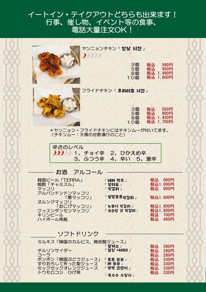 初めてだったので色々頼んでみましたが(海鮮チヂミ、キンパ、ビビンバ、スンデゥブ、ヤムニョムチキン、トッポキ)、何を食べてもとっても美味しかったです。子供はヤムニョムチキンが凄く好きなようでよく食べていました。ご夫婦もとても感じが良く、子連れでも凄く心地が良かったです。是非また行きたいです。