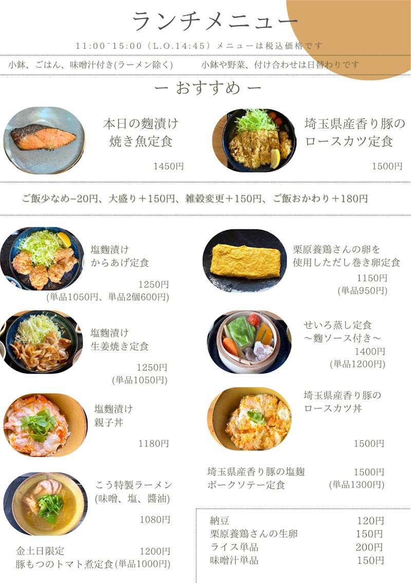 2025年8月13日お昼の11時45分ごろに行きました。お店は約24席ほどあり、まだお昼前で私を合わせて合計3組6名のお客様で余裕の着席!店内は靴を脱いでスリッパに履き替えるスタイルなので、靴下で行った方が良いです!また、駐車場もあるので車で行けて便利!さて、料理ですが…めっちゃ美味しい!てか、提供時間も早い!私は、埼玉県産香り豚のロースカツ定食友人は塩麹漬けからあげ定食サックサクで中はジューシーでした…うますぎさらに、からあげ定食にタルタルソース(150円)が激うますぎ…あ、レシピ貰えませんか?って思いました。てか、これだけ持って帰れますか?笑ランチは+100円でアイスコーヒーかホットコーヒーがつけられます!もう大満足でした!