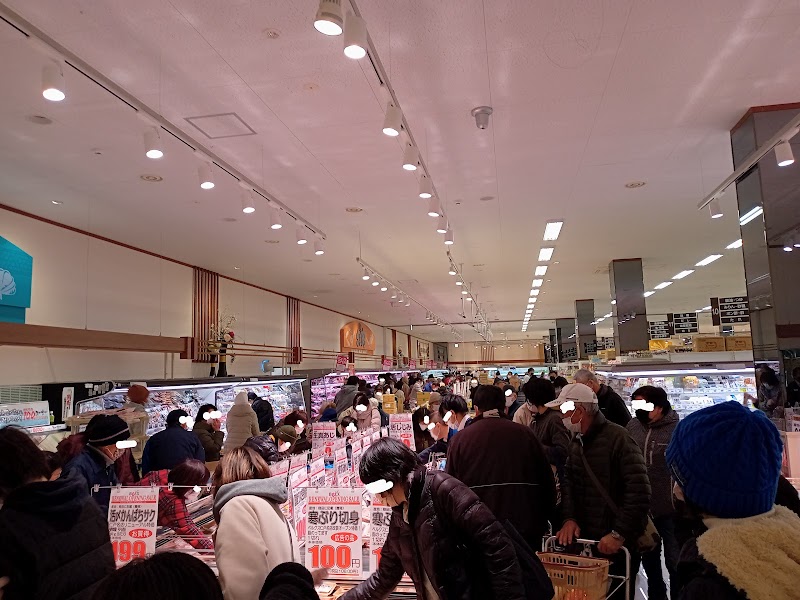 新装開店しての初日は入口で大福も配っておりました。こし餡で柔らかく美味しく頂きました。新装開店なので店内綺麗になり明るくなった気がします。品揃え良く便利ですし新装開店なので安い品が目白押し。目の前に出来るドラッグコ○モスさんを意識の新装開店かな?って思いました。同じ並びに他の店も色々あり便利です。それと翌日の朝市(9時〜)ですが早目の8:30には着きましたが人で店外\u0026店内ごった返してる状態でした。安いので魅力的ですが駐車場が🈵になるのと人がかなりの密なのでで行きづらいのが難点かなと思います。又買い物に伺いたいです。