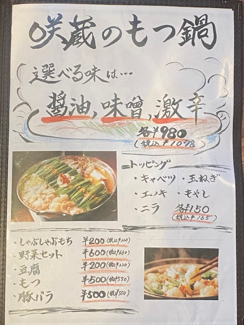 友人に誘われて、初めて出掛けました。モツ鍋は九州博多モツ鍋を彷彿させる美味しさピリ辛(博多駅中のモツ鍋屋さんで食べた味)でした。〆はラーメンか、雑炊を選択出来ましたが、やはり、ラーメンで〆、間違い無し!コースで飲み放題を付けて、飲み放題の種類も多く、満足しました。又、行きたいお店です。若いアルバイトスタッフ、店長さんは気さくで、アットホームなお店でした。