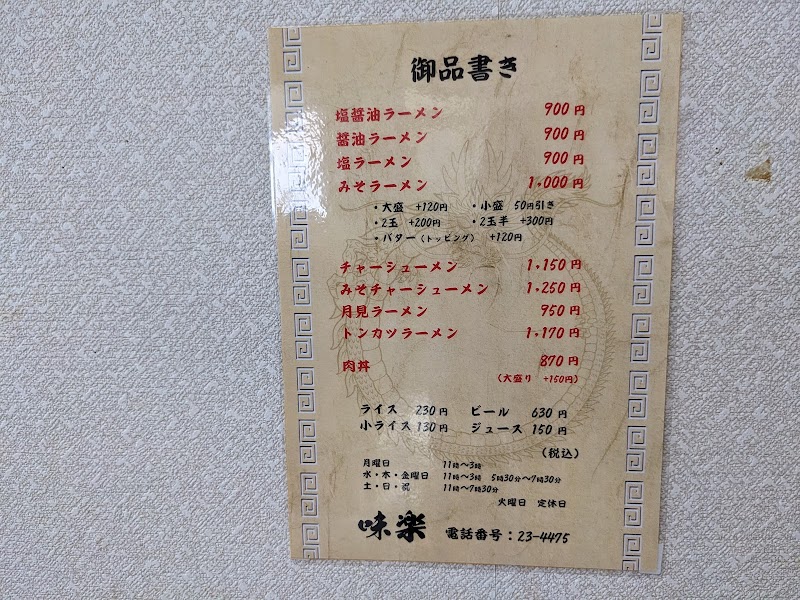 2023/03/04更新醤油ラーメン値上がりしてます。880円から900円になりタマゴが消えました。正直、具に関しては維持して欲しかったです。900円を超えてしまったため、今後行くことは無いです。40年以上食べ続けた味楽さん。ご馳走様様でした。━━━━━━━━━━━━━━K's━━醤油ラーメン最高です。老舗で子どもの頃から食べ続けてます。息子の代になってから味が落ちた時期がありましたが、完全復活。むしろ先代を超えたか?