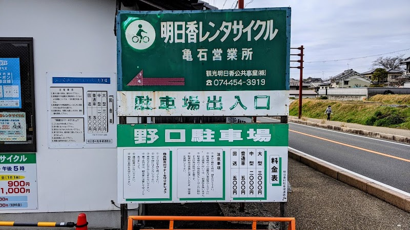 飛鳥、亀石の近く、野口駐車場前の交差点にあるレンタサイクルです。野口駐車場の中にあります。だから車で行ってそのまま自転車借りることが出来るので便利だと想います。駐車場は無料です。また、地理的にも高松塚古墳など飛鳥駅方面、橘寺、岡寺や石舞台方面、飛鳥寺や甘樫丘方面の真ん中あたりなので何処にでも出れます。時間は9時~17時まで、1日千円です。アシスト付きは1500円です。原付バイクもありますが2000円です。(11/3祝日、平日は安くなるみたいです。)御店の方の対応も親切です。未確認ですが、同じレンタサイクルの営業所が飛鳥駅、石舞台などにもあり、借りた場所と違う所でも返せるような事をいっていました。プラス料金がかかるかも?
