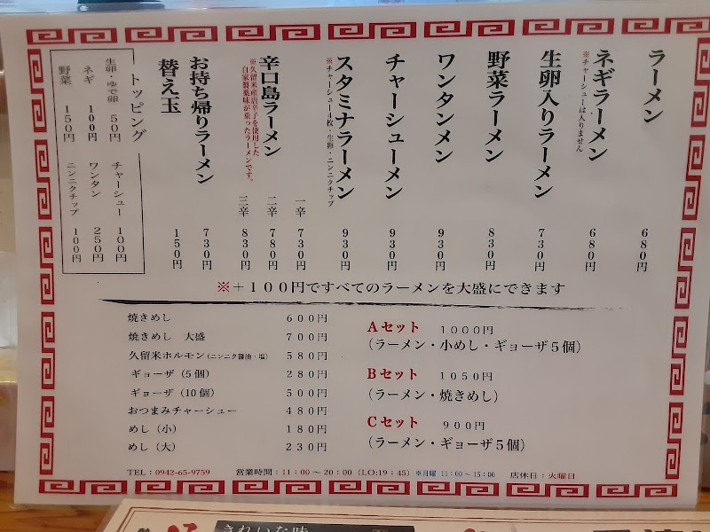久留米方面に用事があり行ってないラーメン屋さんを探してこちらにたどり着きました。大きな看板なのですぐ見つけて入店。早速『Cセット(ラーメン+餃子5ヶ)』を注文。遅めのランチだった為すぐに出されました。麺は細麺でコシがあり、チャーシューは薄めのものが4枚、薬味にねぎが乗っています。スープは塩気のある濃いトンコツで久留米ラーメンはこういう流れと認識しました。濃いスープは嫌いではないし迷わず替え玉し完食しました。次回はメニューにあった久留米産島唐辛子の入った辛口島ラーメンを試そうと思います。ごちそうさまでした。