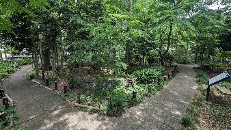 視聴覚室ぐらいの広さの、土はあるが、石畳やコンクリートで舗装されている林。蛇籠や、ポストの台座に使われていた丸石が使われていて、夏場は水があるだろう小川が真ん中辺りにある。一部、竹林の脇に東屋がある。入口辺りに手洗い場があり、奥にテーブル席一つ、石の腰掛け台が一つ。鳥のさえずりと、時折、電車の音だけが聞こえる落ち着く感じの公園。