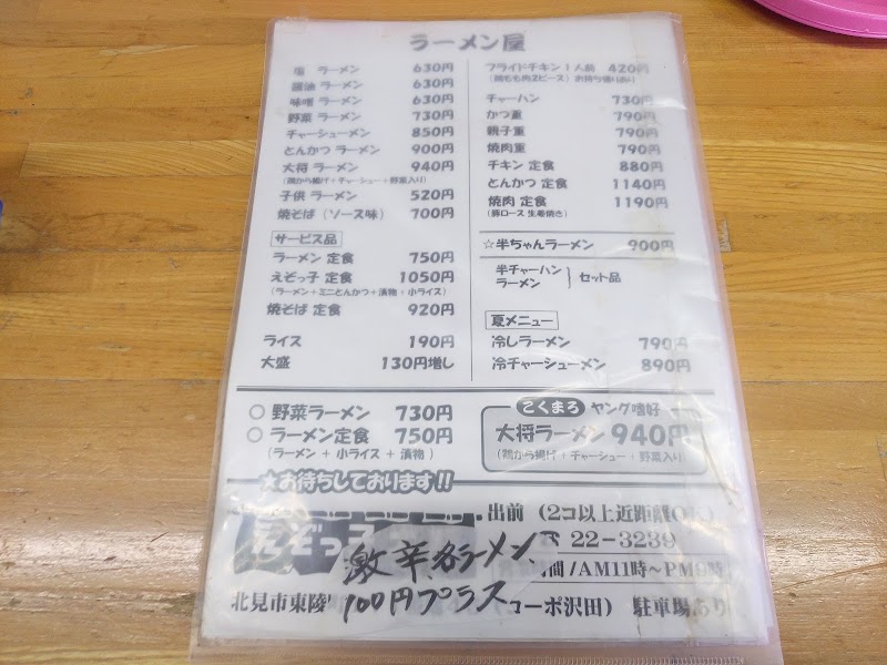私が子供の時、良く祖父母が大将さんのラーメンを出前してくれました。マスターも明るくニコッと笑いラーメンを届けてくれたのを覚えています。私もおじさんの歳になり、祖父母も1年前に亡くなり、仕事で北見に行く事があって久しぶりに寄らせて頂きました。マスターも昔の面影はなかったのですが、私の祖父母の事を覚えており、びっくりしました。周辺が変わり、時代も変わりましたが、ここのラーメン屋が変わっていない事にタイムスリップした感じになりました。また今度、北見に寄った時はラーメン食べさせていただきます。