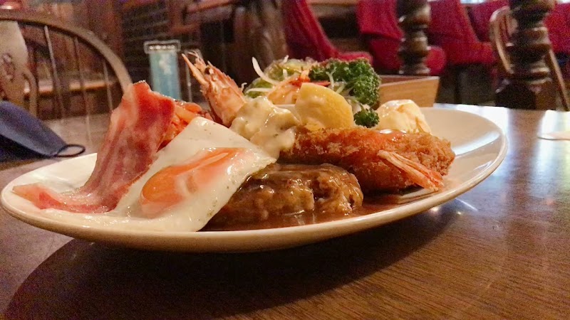 昔ながらの喫茶店で雰囲気の空間と対応が良い店員さん☺️今回はランチで来たのですが海老は大きくハンバーグは少し小さめですがしっかりした肉の味でご飯がめっちゃ進む味でした😋大盛りを頼んだのですが大盛りは自分で止めるシステム❓️みたいな感じで特盛まで突き進み大満足🤗今度はディナーに行ければと思います☺️ただ、ディナーは食材が余っていないと営業していないので電話で確認が必要ですのでお忘れなく❗