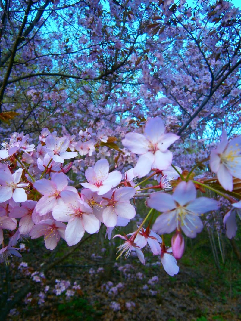 天都山の麓に広がる、桜が美しい時期が魅力的です。
