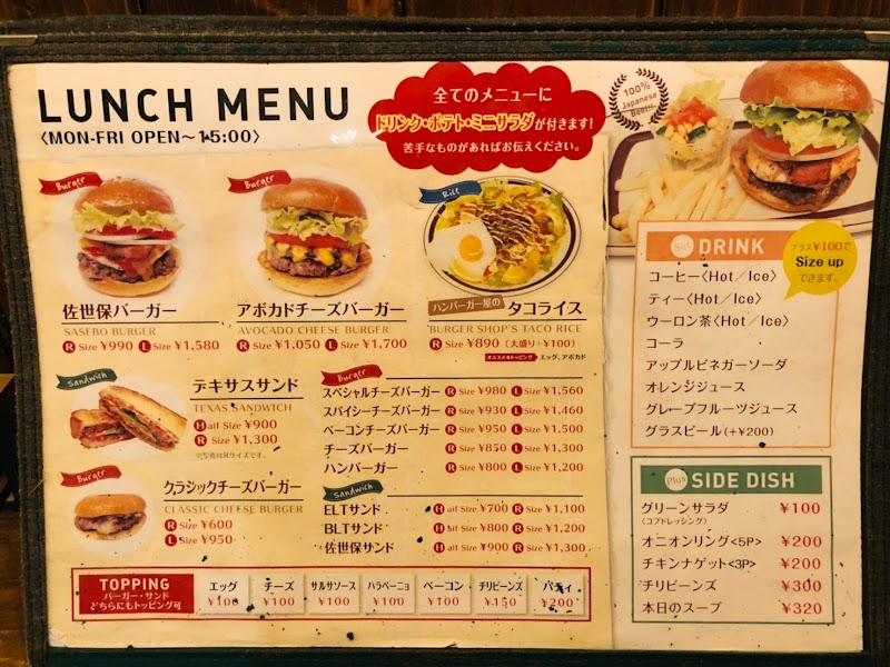佐世保バーガーが自慢の小さなお店で、ランチ時にはお得なランチセットも楽しめる。