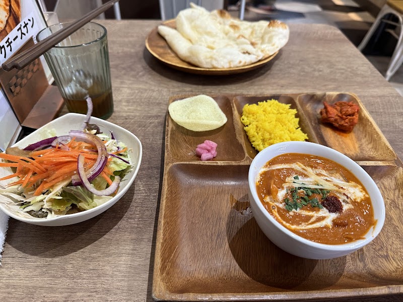 平日ランチで訪問。外観は入り口も目隠しが付いてて中を見れない感じなので、ちょっと入りにくい感じがあります。が、中はキレイにされているので安心して下さい。店員さんは、外国の方ですが丁寧に対応してくれます。ここの特徴は、まずはサラダバー。インドカレー屋さんでは、セットでミニサラダ付いてくるのは定番ですが、サラダバーは見たことない。サラダも、レタス、キャベツ、コーン、オニオン、トマトと十分な種類。ドレッシングも4種類ありました。ゆっくりお喋りしながらサラダを食べてカレーを待ち、カレーと共にサラダも食べ、という方にはお得だと思います。次の特徴は、カレー。本格インドではなく、日本人の好みに寄せた感じです。写真はチキンカレーですが、パッと見はポタージュのように見える感じ。味もスパイスががっつり効いてる感じではなく、まろやかで優しい味です。辛さは0-4で選択可能です。2で食べましたが、ちゃんと辛味はありました。4辛だと激辛レベルになりそうな感じです。辛いのが得意でないかたは1くらいで、得意な方は2か3で様子を見るのが良いかと。ナンはフワッとしたタイプでした。チーズナンでしたが、チーズの味香りは控えめ。食べやすい感じ。チキンカレー、チーズナン、サラダバーで1050円。サラダをお代わりしなきゃ若干割高感あるかも?サラダも食べれる日本人向けカレー屋さんとして、良いお店だと思います。