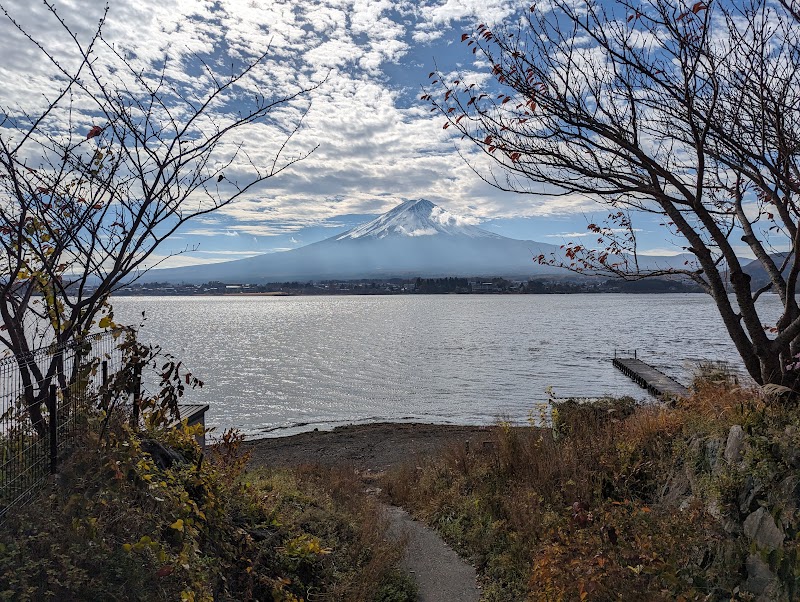 トンネル手前から側道に入ったところに位置します。公園となっていますが、少しばかり車が停められるスペースがあり、湖畔に降りられるようになっている場所です。湖畔を挟んで富士山が観られ、かなりの穴場スポットだと思います。その先にある大石公園はお土産屋さんもあり賑わっているので、静かに観たい方には抜群の場所です。
