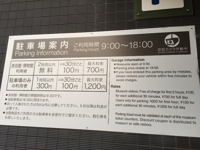 近代美術館の利用で2時間無料になります(チケット購入の際にカウンターで駐車券を提示してください)。毎月第一日曜日の入館料無料の日も同じく2時間無料です。ありがたい。あわせてカフェの利用で+2時間無料になります(お会計の際に駐車券を提示)。すごい親切。屋内の駐車スペースは広くてとても停めやすいです。ありがたい。
