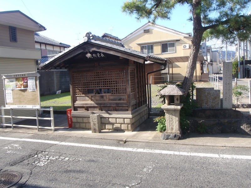 プルシャン太秦の南側にある。木製の大型の祠。鬼瓦と線香受けに卍。妻面に「尊蔵地栄長」の額。右手に松の木と灯篭と石碑。