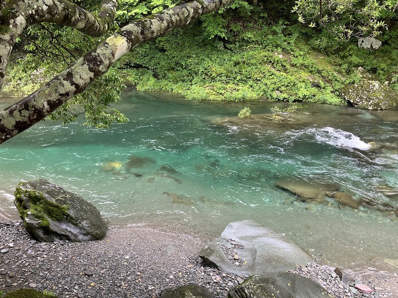 梅雨雨の中でも透き通ったきれいな水が流れていました。ここにたどり着くまでの道は狭いですが、その分、人は少なく穴場です。駐車場からはすぐに河原に下りれます。河原にカエルに似た岩がありました。