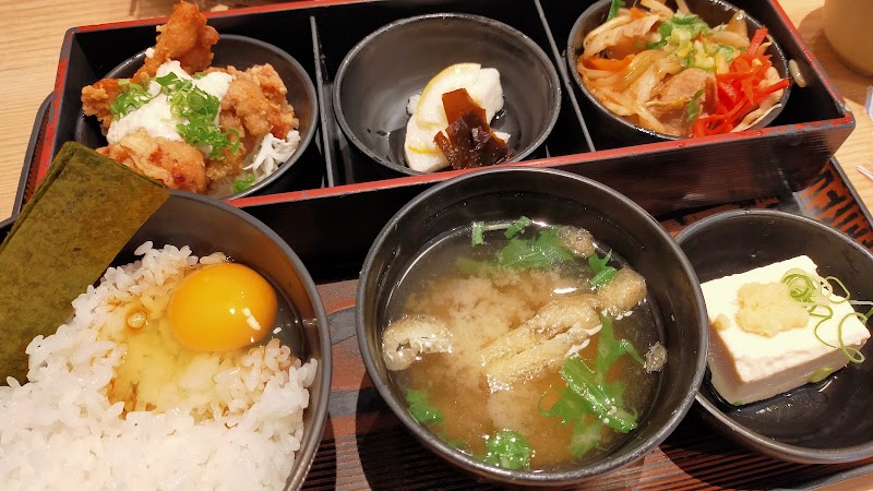 平日ランチで利用。地下一階の店内は広く入り組んでおり、部屋によっては地下にも関わらず外の庭?が見えるようてす。定番料理はとりから定食とかつ玉定食で、これらは固定メニュー。それ以外に小ぼけ弁当(弁当、と銘打ってますが普通に定食です)と魚定食とあり、これらは曜日でメニューが変わります。この日は小ぼけ定食を選択、メニューは煮込みハンバーグ&揚げ鶏ネギソース。注文してから出てくるのも早いし、ご飯・卵・海苔・漬物・味噌汁はおかわり自由なのも非常に嬉しいポイント。卵と海苔と漬物はテーブルに常備されており、好きに使って良いというスタイルです。思わず、数年ぶりにTKGを頂きました。各料理とも味も勿論文句なし、この質と量で1,100円は破格かなと。12時には行列が階段上に達する人気店というのも頷けます。