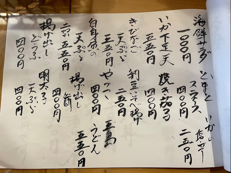 お店の前は何度も通過していましたが、お弁当屋さんだと思っていました。店内食も出きることを知り行ってきました。お店は11:30オープン。店内はカウンターのみ8席と、少ないとの情報だったので、オープンの30分前に到着。オープン前、店頭に順番待ちのノートが置かれているので、名前と車のナンバーを書いて駐車場で待機。順番が来ると店員さんが呼びに来て下さいます。今日(日曜日)はオープン時間には10組以上のお名前が記入されていました。3組目としてワンサイクル目に入店出来ました。人気の海鮮丼定食、天麩羅付き。お刺身定食、天麩羅付き。あら汁をいただきました。カウンター席の目の前で調理。お魚を捌いたり、天麩羅を揚げています。お魚は新鮮で肉厚も程よくあってプリプリでした。天麩羅はサクサクで美味しかったです。ニンジンやお芋は甘くて野菜そのものが美味しいのでしょう。あら汁は、定食に着くお味噌汁にあらが、入っているのかな?キャベツや油揚げが入っているので、あらだけで作った方が良かったかな。煮付けやアジフライ、和牛のステーキもあるようなので、次回また来たいと思います。