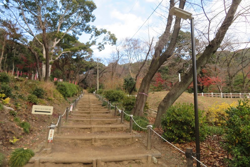 小牧市役所側からの登り口。城へ向かってまっすぐ登るのでけっこう坂が急です。真っ直ぐな大手道を持つ城は、全国で2つのみで、信長が造った安土城と、ここ「小牧山城」のみ!
