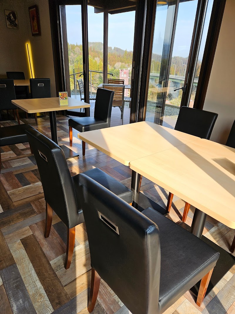 駐車場から階段で登り、お洒落で小柄な建物です。真新しい店内からは山々の景色が望めます。食事は街なかでしか食べられ無いようなお洒落なものが多いようで、それらをゆっくりと楽しめました。