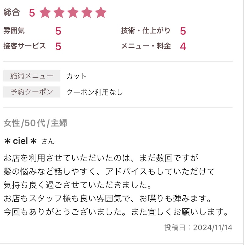 美容師さんとは長い付き合いになるのもあって、いつもわたしの思ってる通りにしてくださいます。ざっくりなイメージでもわたしの想像している通りか、それ以上に仕上げてくださるので毎回満足してます。遠方からの為、なかなか通うことが出来ないことも考慮してカットやカラーもしてくださいます。お話も楽しくていつも居心地がいいです。一人一人に合った対応をしてくださるので、安心してお任せできます。これからも通わせていただきます!