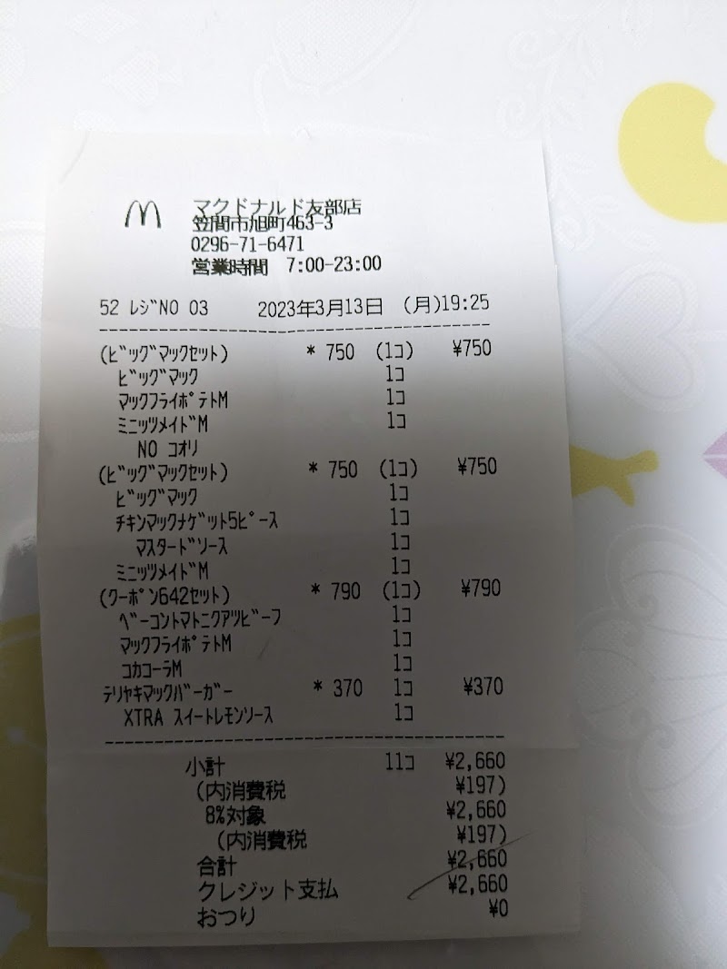 お盆中の昼間に行ったが思っていたより空いていた。注文して他店だとレシートに番号が記載して、それ番号で受け取りになるが友部店は番号札を渡されてテーブルまで届けてくれた。注文が込み合いで直ぐに渡せない時には他店でも番号札が渡されるが、自分が席に座って直ぐに注文品が届いたのでちょっとびっくりはしたがゆっくり食べることができたので良かった。ただドライブスルーはわりと普段から混んでいる様に思う。