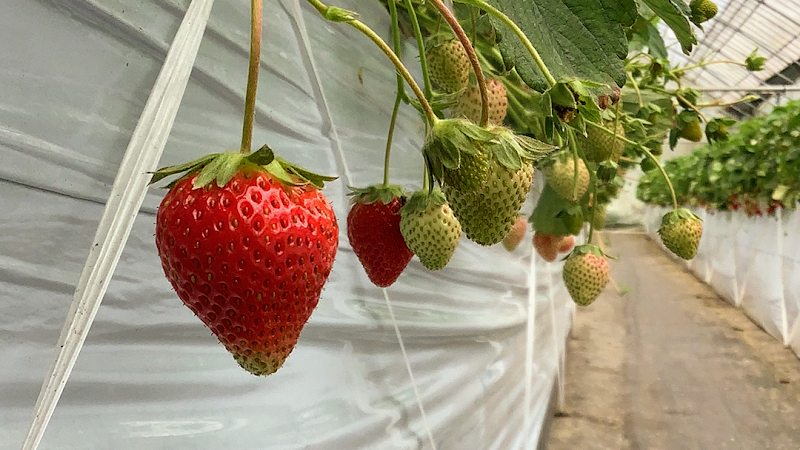 広いビニールハウスで、数種類のイチゴが栽培されている様子が魅力的です。