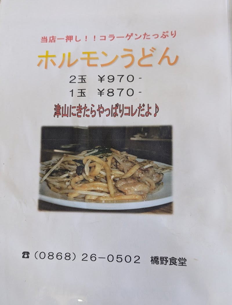津山市のB級グルメ・津山ホルモンうどんで有名なお店です。東津山駅から徒歩10分ほどですが、便数が少なく公共交通機関でのアクセスはいいとは言えません。食堂という名のとおり、店内は街の大衆食堂という雰囲気で、どちらかというと観光客よりも地元の人向けのお店という雰囲気です。メニューもホルモンうどんのみではなくほかにもあります。ホルモンうどんは辛さが普通・ピリ辛・激辛の3段階あります。値段はどれも同じです。普通を注文しましたが、それでも多少は辛さがありました。個人的にはもっと甘い味付けのほうが好きなんだけどな、と思う部分はありましたが、これが津山ホルモンうどんの味付けなのかな・・?