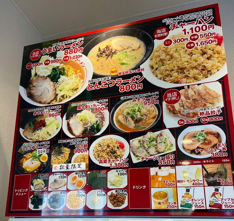 平日昼に伺いましたが、駐車場は満車じゃなかったけど、少し待たないと店内には入れないぐらいでした。人気店ですね!うまいラーメンは豚骨醤油ベースの食べごたえのある太めのストレート麺海苔、生キャベツ、ほうれん草、ネギ、チャーシューがのっていて、1口1口味変を楽しみながら、食べることが出来ます。スープはなめらかで、ご飯に合う感じが自分好みで最高でした!店内は綺麗で店員さんの対応も丁寧。ザ王道の美味しいラーメンって言う感じが自分には合ってました!また行きたいと思います。