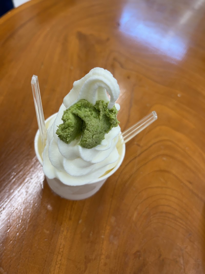 おろしたて新鮮生わさびが添えてあります。大さじ一杯分位。サッパリしたジャージー牛乳ソフトクリームとの相性は抜群です‼️遠慮しながら食べ進めると最後にわさびが余るのでツラい(辛い)です。バランス良く食べ進めましょう❗️とてと美味しいです‼️おすすめします。
