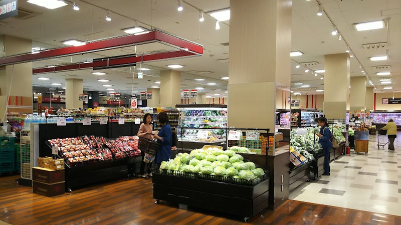 自由に座ることができる座席がたくさんある通路が太く広々としたスーパー。