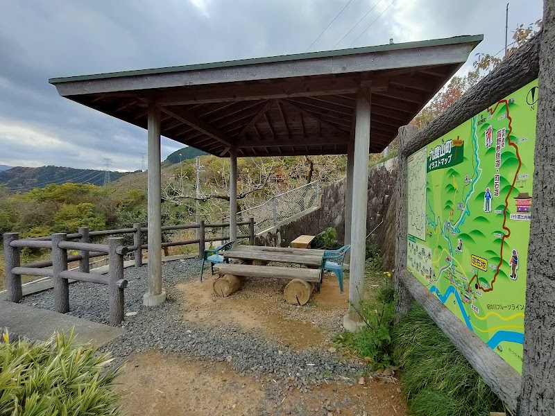 高野山へ続く町石道を登り始めて最初に座って休息のできる場所です。ベンチとテーブルがある東屋があり、強い日差しの日でも安心して休息出来ました。名前の如く、紀の川沿いに広がる町並みを見下ろすことが出来る展望台です。周りはみかんの果樹園が広がるのどかな場所ですが、ここから先、町石道は熊出没注意の看板が乱立する山深い尾根峰を通る道になっていきます。人里から山の中に入る直前の休息場所でもあるので、少し英気を養うのに良い場所だと思います。