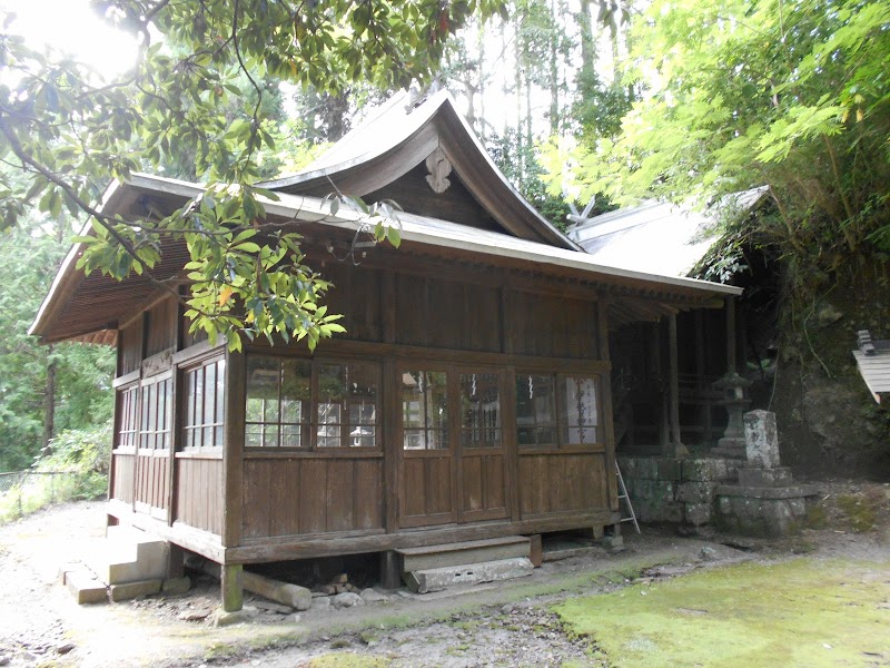 神社は地域道の左手、道沿いの高台にある。150段位の石段を上ると、一段高い拝殿・本殿に上る広場に出る。次に2か所から上れるように作られた石段を上ると拝殿・本殿に着く。境内には境内社を一つにまとめた祠がある。