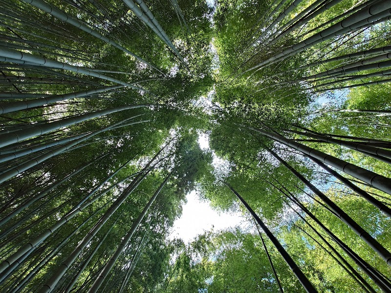 神宿る竹林の看板から右の細い林道の方へ200m程登った辺りの景色です。遊歩道から上を見上げると真っ直ぐな竹が織り成す風景に感動します。この日は風が通る音も素敵でした。