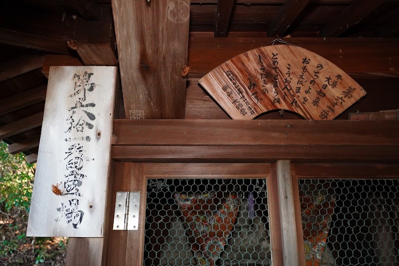 稲荷への経路(歩道)の入口にあります。扇面額に四国88の61番 教王院 香園寺の御詠歌「後の世を 思えば詣れ 香園寺 止めて止まらぬ 白滝の水」とあります。